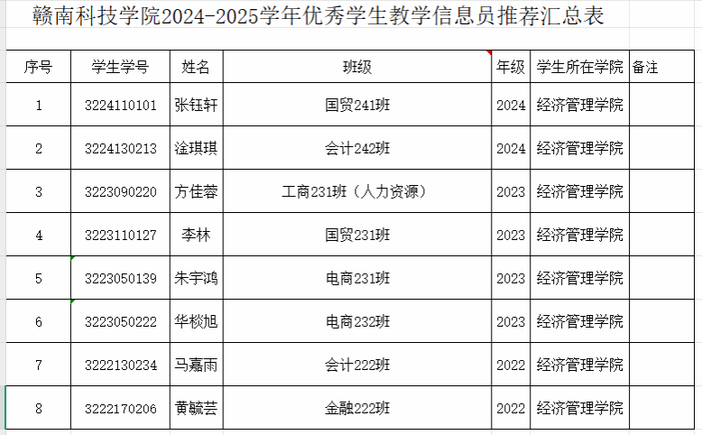 根据《赣科院教字(2024)4号关于印发《yL23411永利集团教学信息员制度(试行)》的通知》要求,经学生个人申请、学院审核等程序,拟推荐国贸241班张钰轩等8位同学为优秀学生教学信息员初评人选,现将初评人选的相关情况公示如下(按年级学号排序):