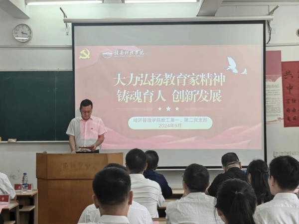 本网讯:9月24日下午,我院教工第一、第二党支部以“大力弘扬教育家精神,铸魂育人,创新发展”为主题,在新民楼207教室联合开展主题党日示范观摩活动。学校党委委员、纪委书记陈文新及兄弟党委观摩代表出席此次活动。活动由学院教工第一党支部书记罗银生主持。