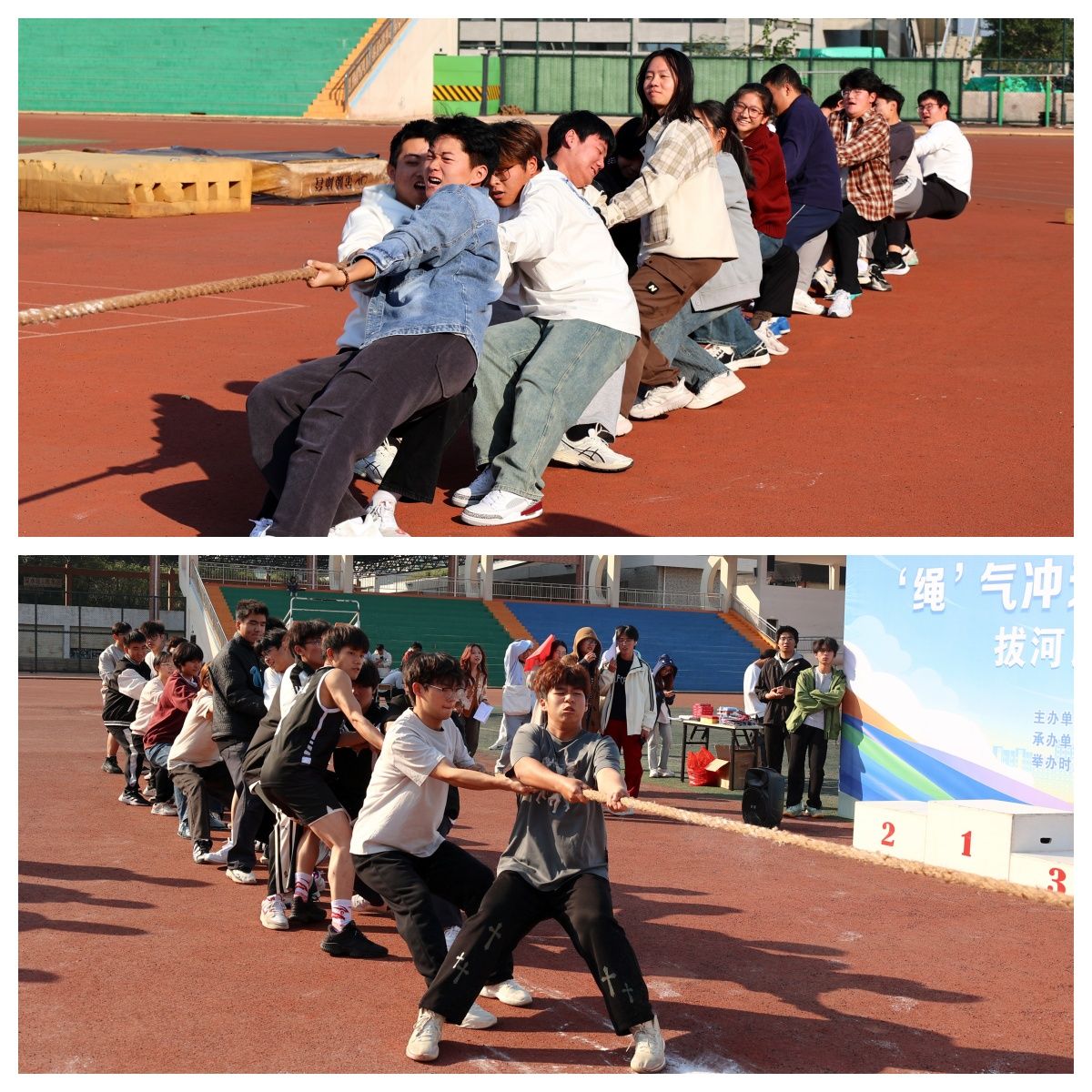 本次拔河比赛以学院为单位,采用淘汰制。各学院参赛队伍在赛前进行了充分的热身和战术讨论。随着裁判的一声哨响,比赛正式开始。双方队员紧紧握住绳索,齐声呐喊发力,现场气氛紧张而热烈。比赛过程中,有的队伍凭借出色的力量与默契配合,迅速占据优势,一鼓作气赢得比赛;有的队伍则在僵持阶段展现出坚韧不拔的毅力,尤其是在半决赛和决赛阶段,队员们咬紧牙关、拼尽全力,将比赛气氛推向高潮。各学院的啦啦队也不甘示弱,加油声、呐喊声此起彼伏,为比赛增添了更多的激情和活力。