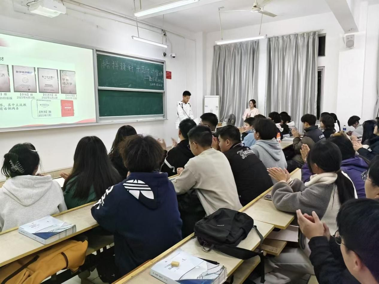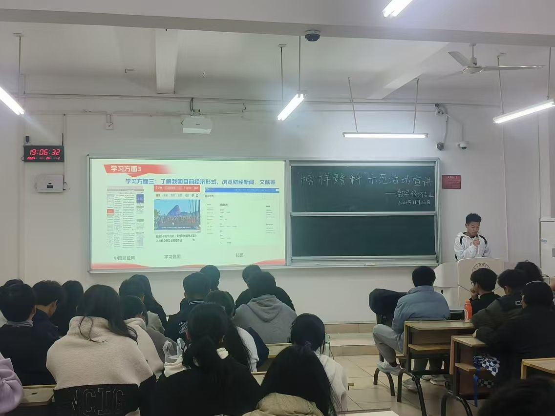 本网讯:为进一步激发同学们的学习热情,从优秀学生榜样中汲取力量,11月25日,永利yl23411集团举办“榜样赣科”主题宣讲活动。本次活动邀请获得2024年国家奖学金的涂传同学为大家分享自己的学习经历与感悟,2024级数字经济专业全体学生参加。