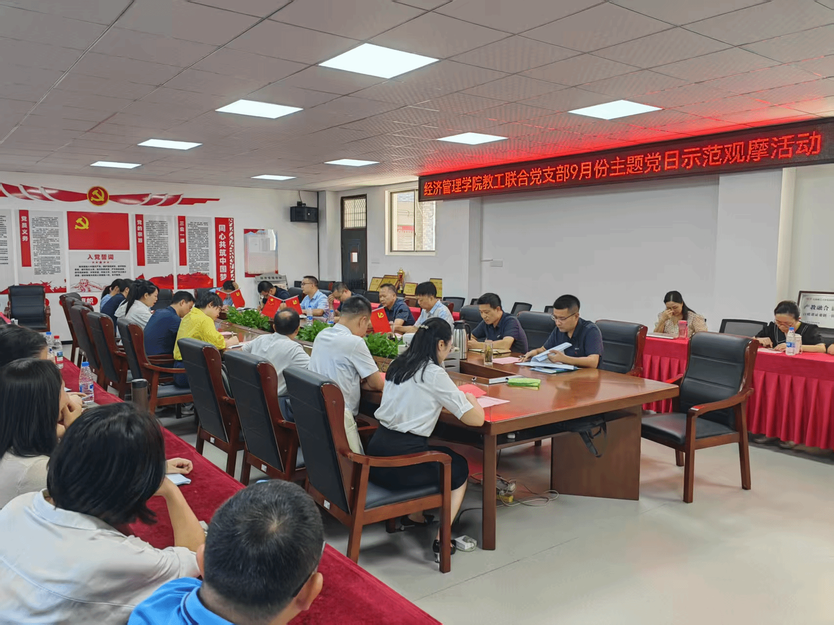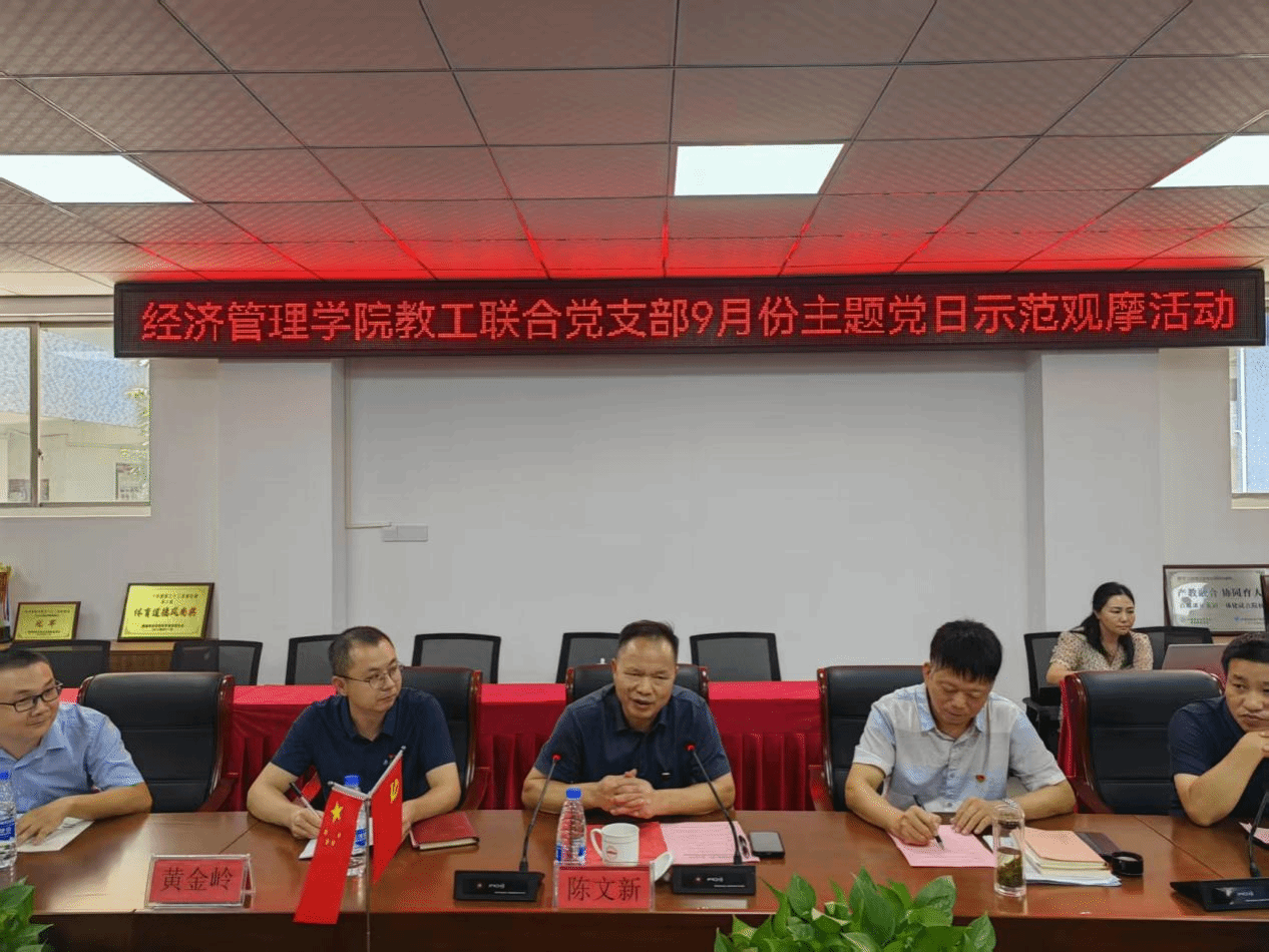 本网讯:为深入学习贯彻习近平总书记重要讲话精神,大力弘扬教育家精神,强化教师队伍建设,9月28日上午,经管学院教工第一、第二党支部在学院305会议室联合开展了“以教育家精神强师铸魂,谱写教育强国建设华章”为主题的主题党日示范观摩活动。yL23411永利集团党委委员、纪委书记陈文新出席活动,学校相关职能部门及各二级学院观摩同志,永利yl23411集团教工第一、第二党支部全体党员共同参与,活动由学院教工第一党支部书记黄金岭主持。
