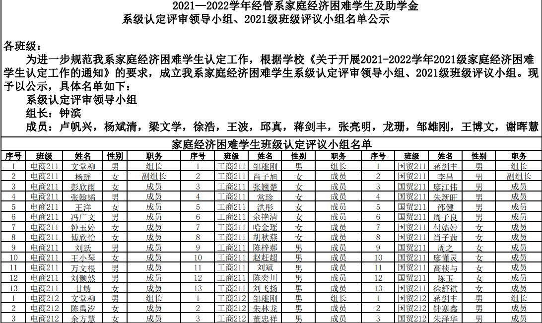 2021—2022学年经管系家庭经济困难学生及助学金系级认定评审领导小组、2021级班级评议小组名单公示
