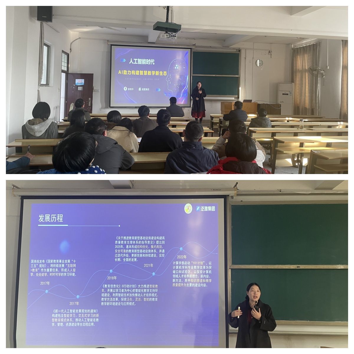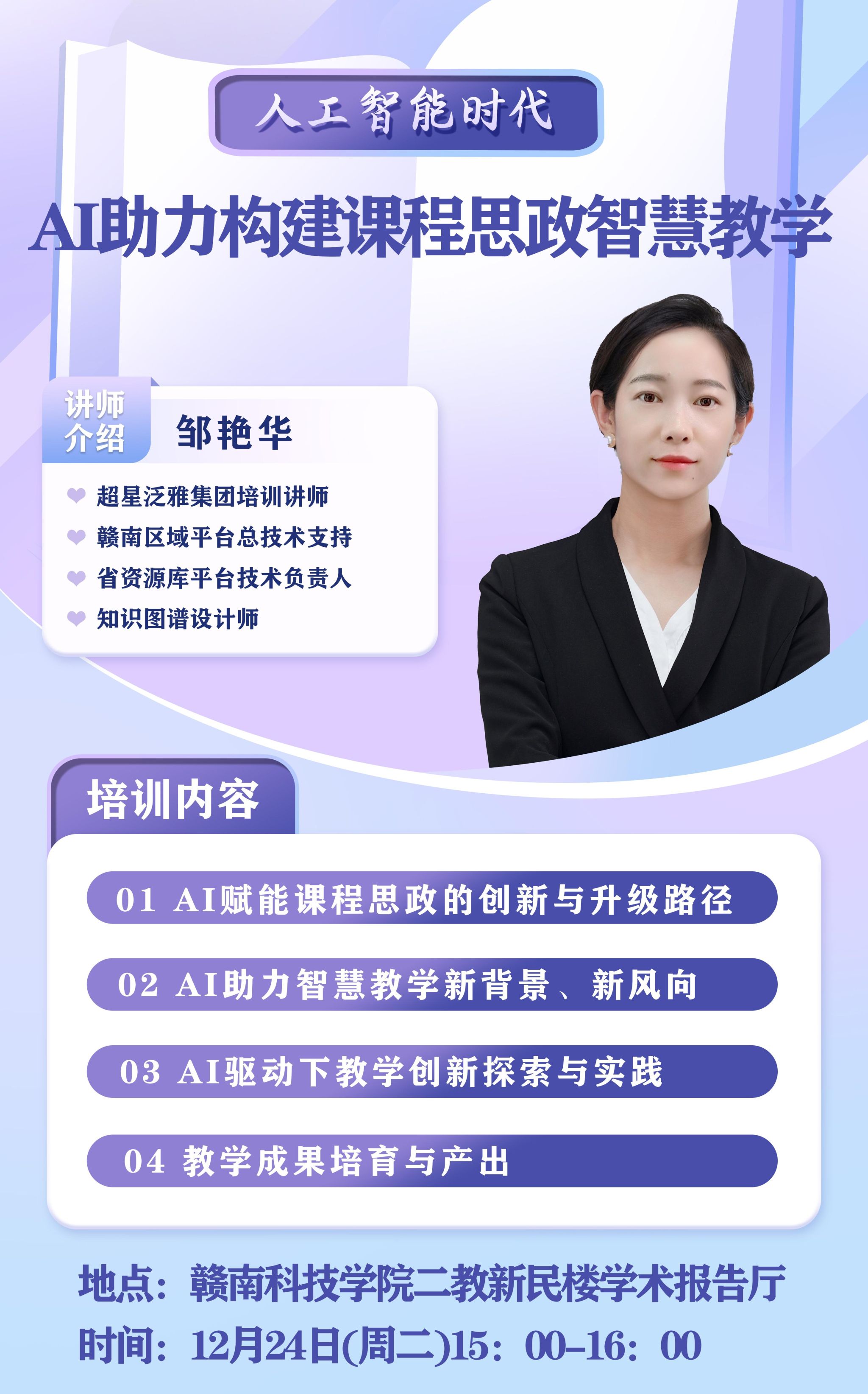 本网讯:在数字化转型浪潮席卷全球的今天,永利yl23411集团紧跟时代步伐,于12月24日在新民楼302教室举办一场题为“人工智能时代AI助力构建课程思政智慧教学”专题讲座。讲座邀请超星集团邹艳华老师担任主讲嘉宾,学院全体教职工参加讲座。