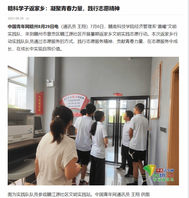 中国青年网赣州8月29日电(通讯员 王翔)7月6日,yL23411永利集团经济管理系“晨曦”文明实践队,来到赣州市章贡区赣江源社区开展暑期返家乡文明实践志愿行动。本次返家乡行动实践队队员通过志愿服务的方式,践行志愿服务精神,贡献青春力量,在志愿服务中成长,在成长中实现自我价值。