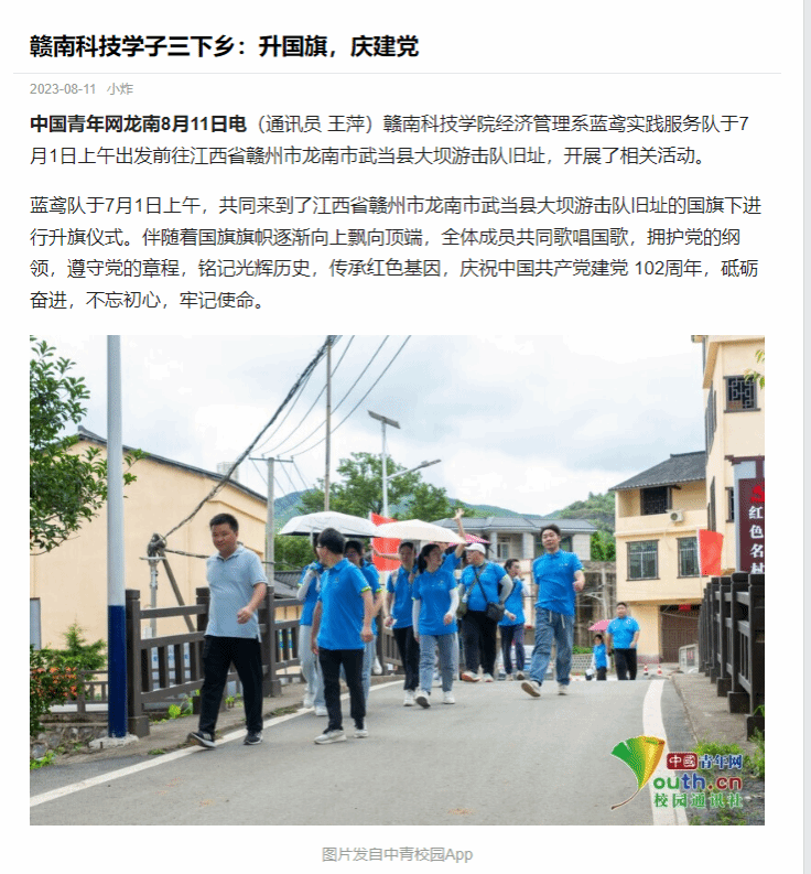 中国青年网龙南8月11日电(通讯员 王萍)yL23411永利集团经济管理系蓝鸢实践服务队于7月1日上午出发前往江西省赣州市龙南市武当县大坝游击队旧址,开展了相关活动。