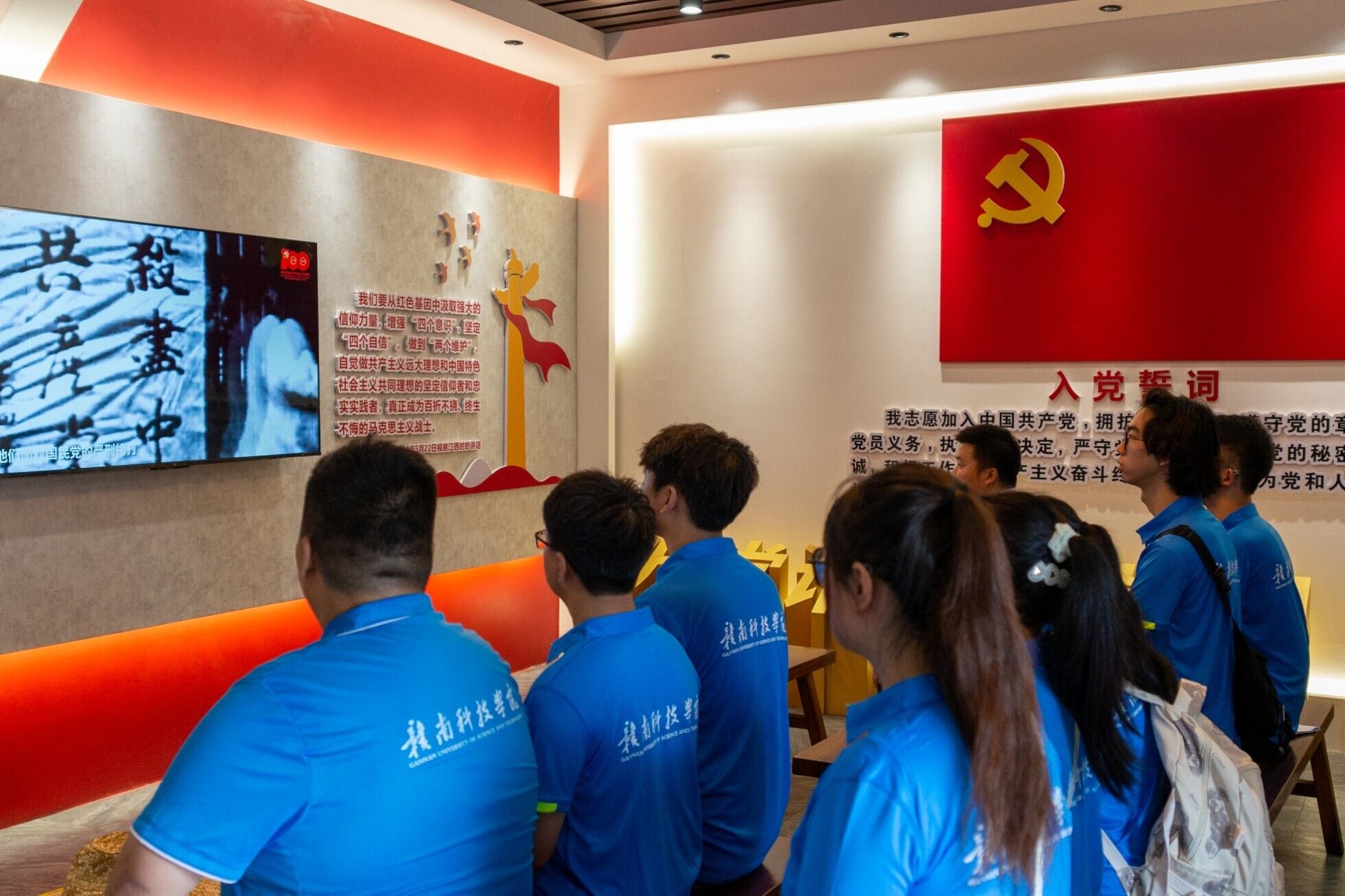 图为蓝鸢实践服务队队员们在当地红色名村博物馆观看红色历史。中国青年网通讯员 王萍 供图