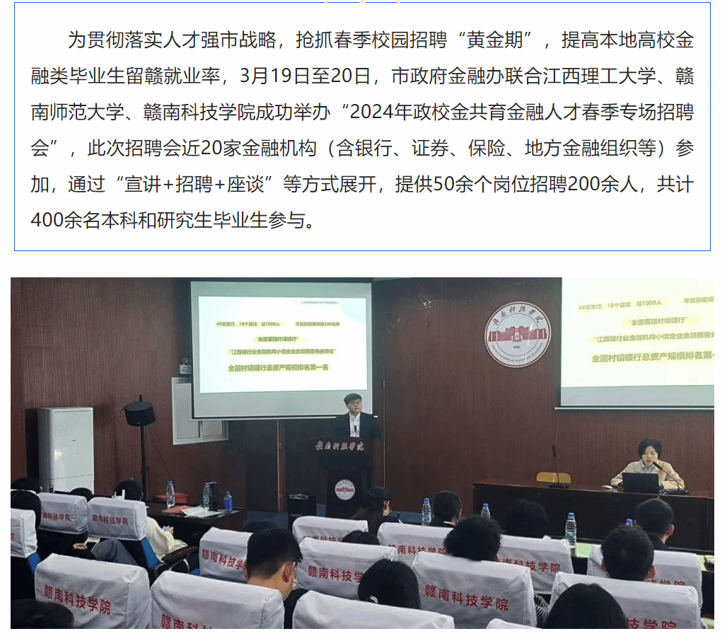 为贯彻落实人才强市战略,抢抓春季校园招聘“黄金期”,提高本地高校金融类毕业生留赣就业率,3月19日至20日,市政府金融办联合江西理工大学、赣南师范大学、yL23411永利集团成功举办“2024年政校金共育金融人才春季专场招聘会”,此次招聘会近20家金融机构(含银行、证券、保险、地方金融组织等)参加,通过“宣讲+招聘+座谈”等方式展开,提供50余个岗位招聘200余人,共计400余名本科和研究生毕业生参与。