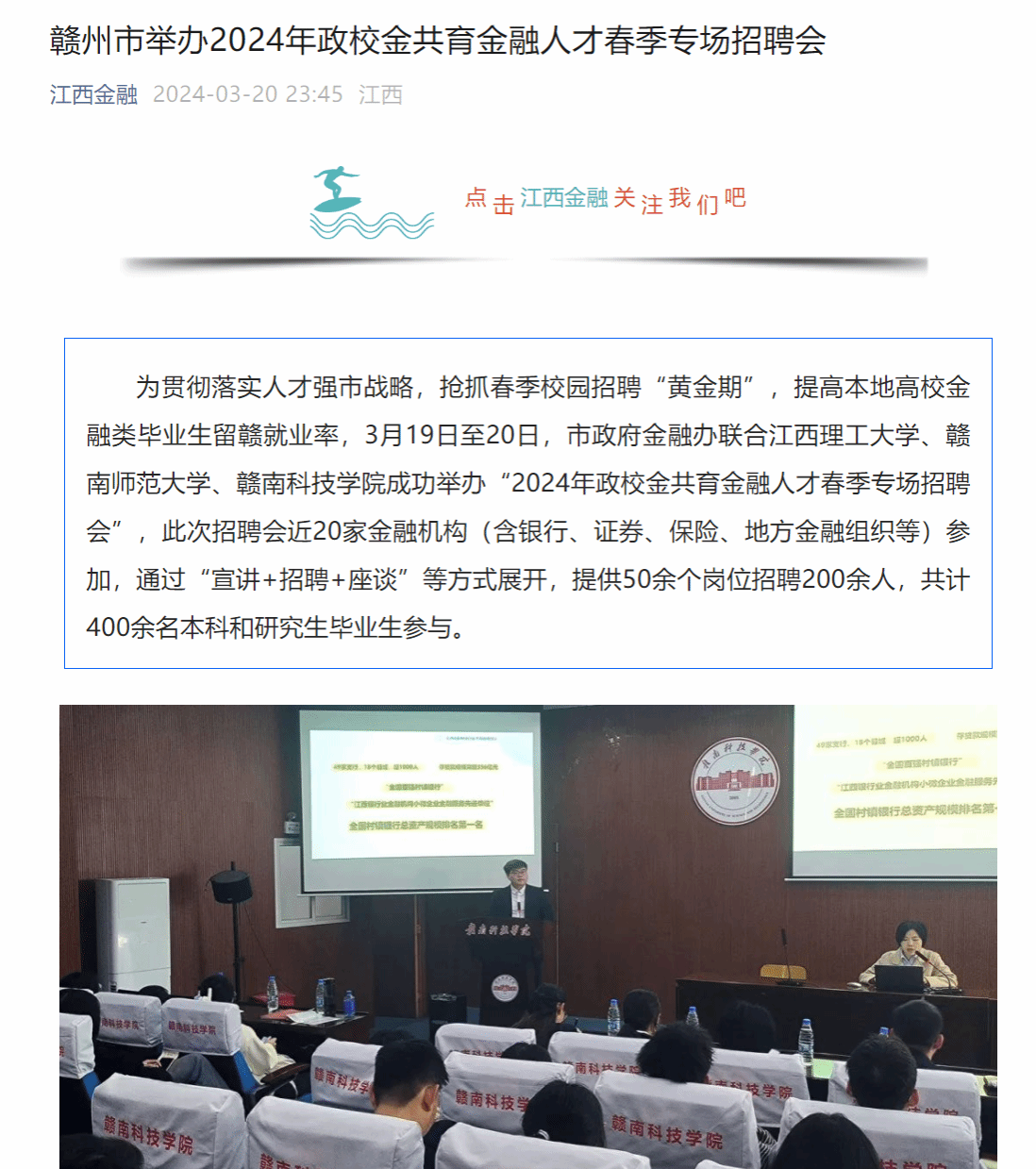 为贯彻落实人才强市战略,抢抓春季校园招聘“黄金期”,提高本地高校金融类毕业生留赣就业率,3月19日至20日,市政府金融办联合江西理工大学、赣南师范大学、yL23411永利集团成功举办“2024年政校金共育金融人才春季专场招聘会”,此次招聘会近20家金融机构(含银行、证券、保险、地方金融组织等)参加,通过“宣讲+招聘+座谈”等方式展开,提供50余个岗位招聘200余人,共计400余名本科和研究生毕业生参与。
