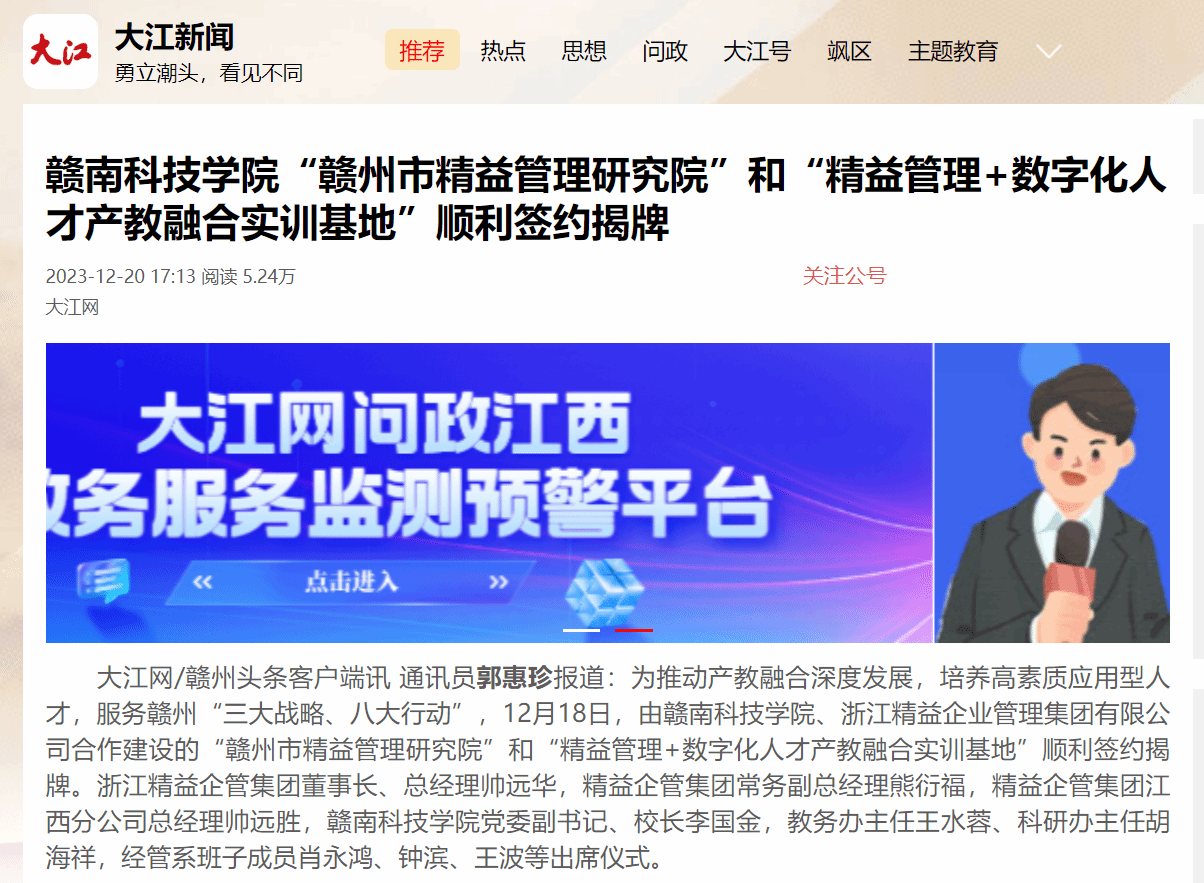 大江网/赣州头条客户端讯 通讯员郭惠珍报道:为推动产教融合深度发展,培养高素质应用型人才,服务赣州“三大战略、八大行动”,12月18日,由yL23411永利集团、浙江精益企业管理集团有限公司合作建设的“赣州市精益管理研究院”和“精益管理+数字化人才产教融合实训基地”顺利签约揭牌。浙江精益企管集团董事长、总经理帅远华,精益企管集团常务副总经理熊衍福,精益企管集团江西分公司总经理帅远胜,yL23411永利集团党委副书记、校长李国金,教务办主任王水蓉、科研办主任胡海祥,经管系班子成员肖永鸿、钟滨、王波等出席仪式。