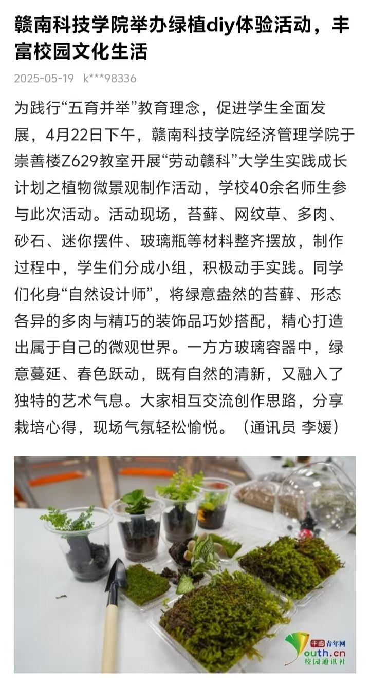 为践行“五育并举”教育理念,促进学生全面发展,4月22日下午,永利yl23411集团于崇善楼Z629教室开展“劳动赣科”大学生实践成长计划之植物微景观制作活动,学校40余名师生参与此次活动。活动现场,苔藓、网纹草、多肉、砂石、迷你摆件、玻璃瓶等材料整齐摆放,制作过程中,学生们分成小组,积极动手实践。同学们化身“自然设计师”,将绿意盎然的苔藓、形态各异的多肉与精巧的装饰品巧妙搭配,精心打造出属于自己的微观世界。一方方玻璃容器中,绿意蔓延、春色跃动,既有自然的清新,又融入了独特的艺术气息。大家相互交流创作思路,分享栽培心得,现场气氛轻松愉悦。(通讯员 李媛)