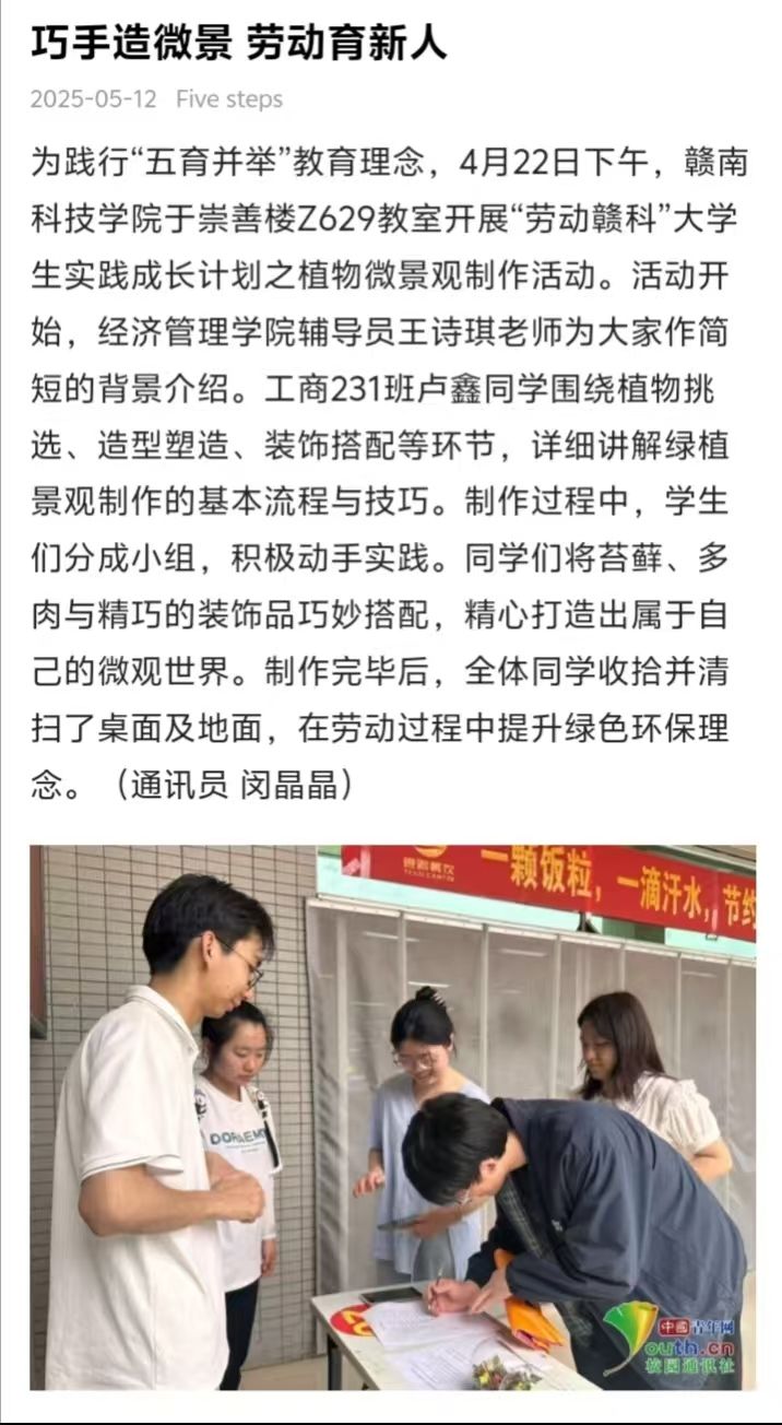 为践行“五育并举”教育理念,4月22日下午,yL23411永利集团于崇善楼Z629教室开展“劳动赣科”大学生实践成长计划之植物微景观制作活动。活动开始,永利yl23411集团辅导员王诗琪老师为大家作简短的背景介绍。工商231班卢鑫同学围绕植物挑选、造型塑造、装饰搭配等环节,详细讲解绿植景观制作的基本流程与技巧。制作过程中,学生们分成小组,积极动手实践。同学们将苔藓、多肉与精巧的装饰品巧妙搭配,精心打造出属于自己的微观世界。制作完毕后,全体同学收拾并清扫了桌面及地面,在劳动过程中提升绿色环保理念。(通讯员 闵晶晶)