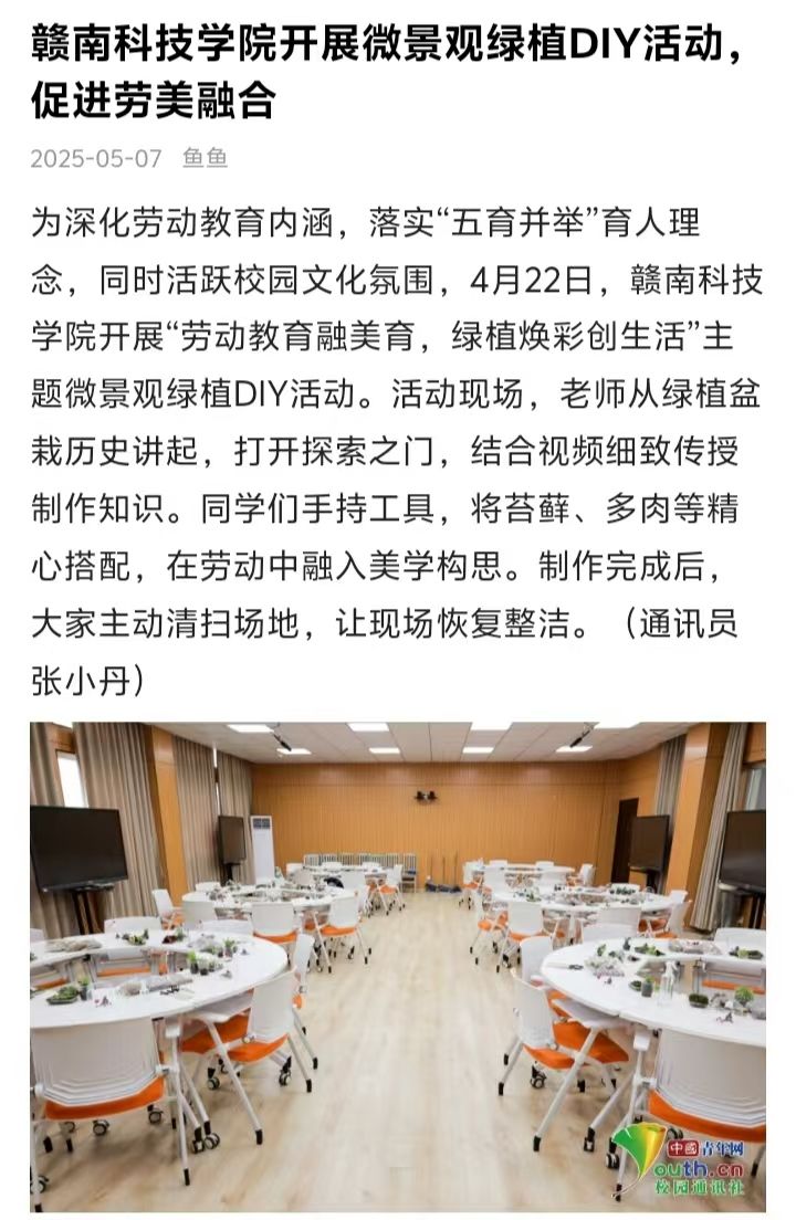 为深化劳动教育内涵,落实“五育并举”育人理念,同时活跃校园文化氛围,4月22日,yL23411永利集团开展“劳动教育融美育,绿植焕彩创生活”主题微景观绿植DIY活动。活动现场,老师从绿植盆栽历史讲起,打开探索之门,结合视频细致传授制作知识。同学们手持工具,将苔藓、多肉等精心搭配,在劳动中融入美学构思。制作完成后,大家主动清扫场地,让现场恢复整洁。(通讯员 张小丹)